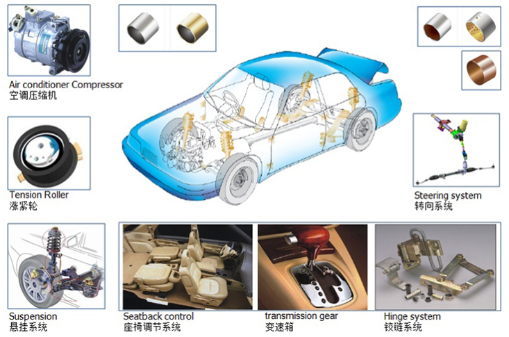 专门开发了切合RoHS环保要求的SF-1、SF-2和FB090等自润滑轴承质料用于汽车邻域,,,,,, 一辆乘用车上至少有30个以上的部位装有自润滑轴承。。。。。。。好比:涨紧轮、空调压缩机、二次空气阀、燃油泵、启动电机、变速箱、转向泵、转向柱、避震器、制动系统、踏板总成、座椅调理系统、门铰链、行李箱铰链、引擎盖铰链、雨刮器等。。。。。。。
