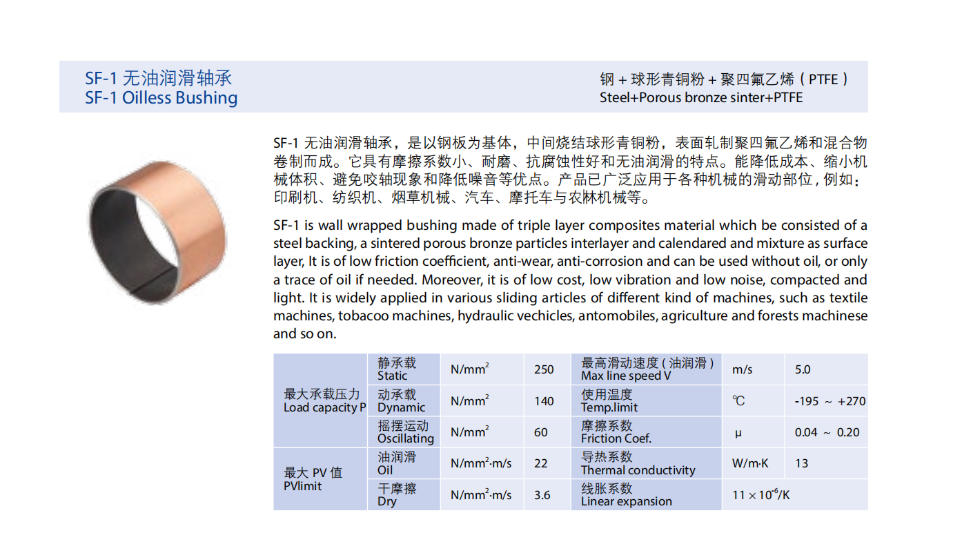 SF-1 / DU无油润滑轴承,,,,,,,,是以钢板为基体,,,,,,,,中心烧结球形青铜粉,,,,,,,,外貌轧制聚四氟乙烯和混淆物 卷制而成。。。。。。。。它具有摩擦系数小、耐磨、抗侵蚀性好和无油润滑的特点。。。。。。。。能降低本钱、缩小机 械体积、阻止咬轴征象和降低噪音等优点。。。。。。。。产品已普遍应用于种种机械的滑动部位 , 例如: 印刷机、纺织机、烟草机械、汽车、摩托车与农林机械等....